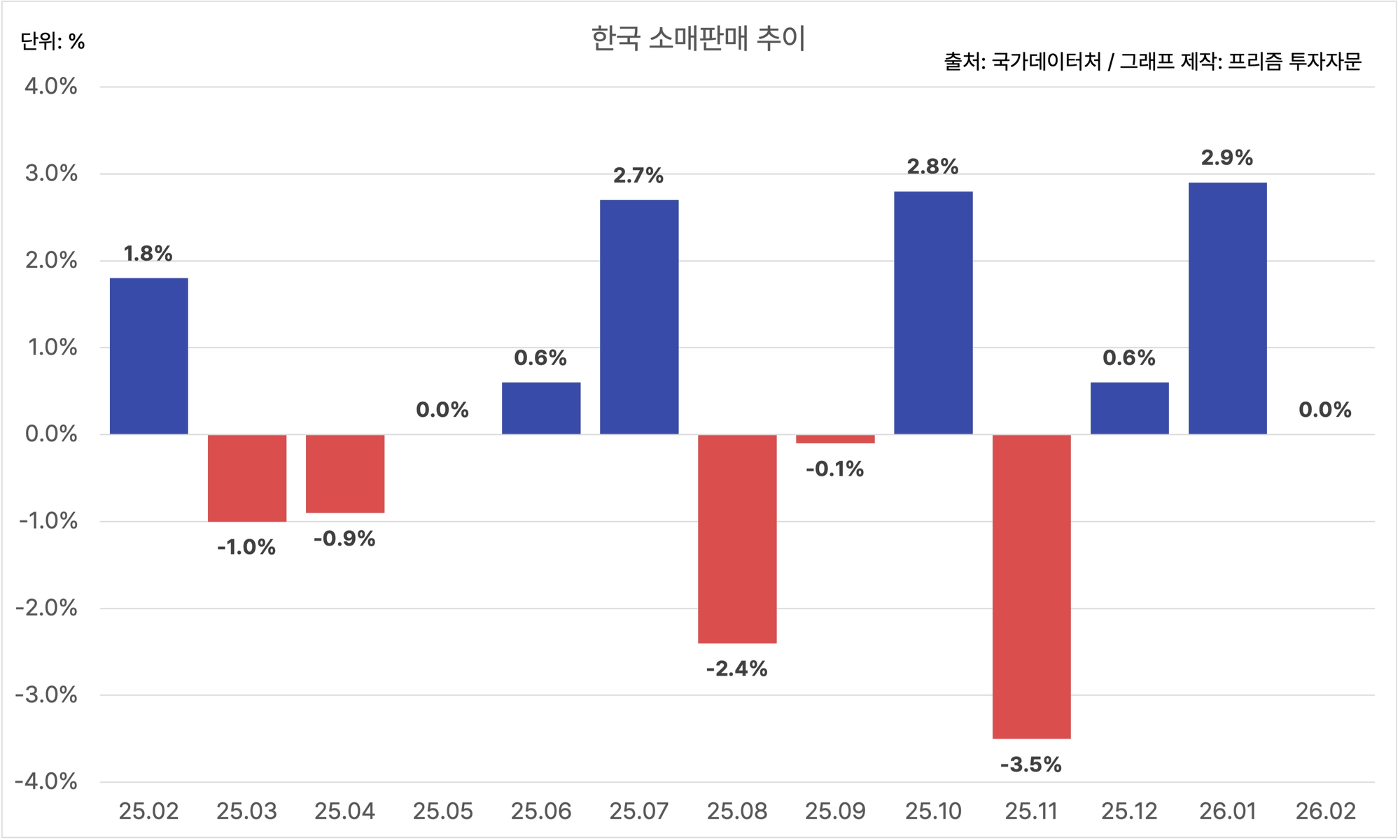 한국의 2월 소매판매는 MoM 0.0%에요.