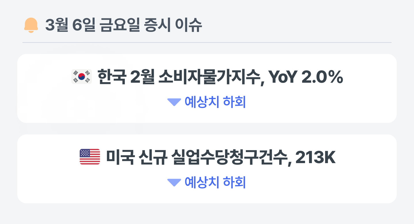 한국의 2월 소비자물가지수는 예상치를 하회했으나, 근원 물가와 개인서비스 부문의 하방 경직성이 상존하는 양상이에요. 중동발 유가 상승분이 3월 지표에 반영될 가능성이 높은 만큼, 물가 안정화 경로 내 변동성이 재차 확대될 전망이에요.