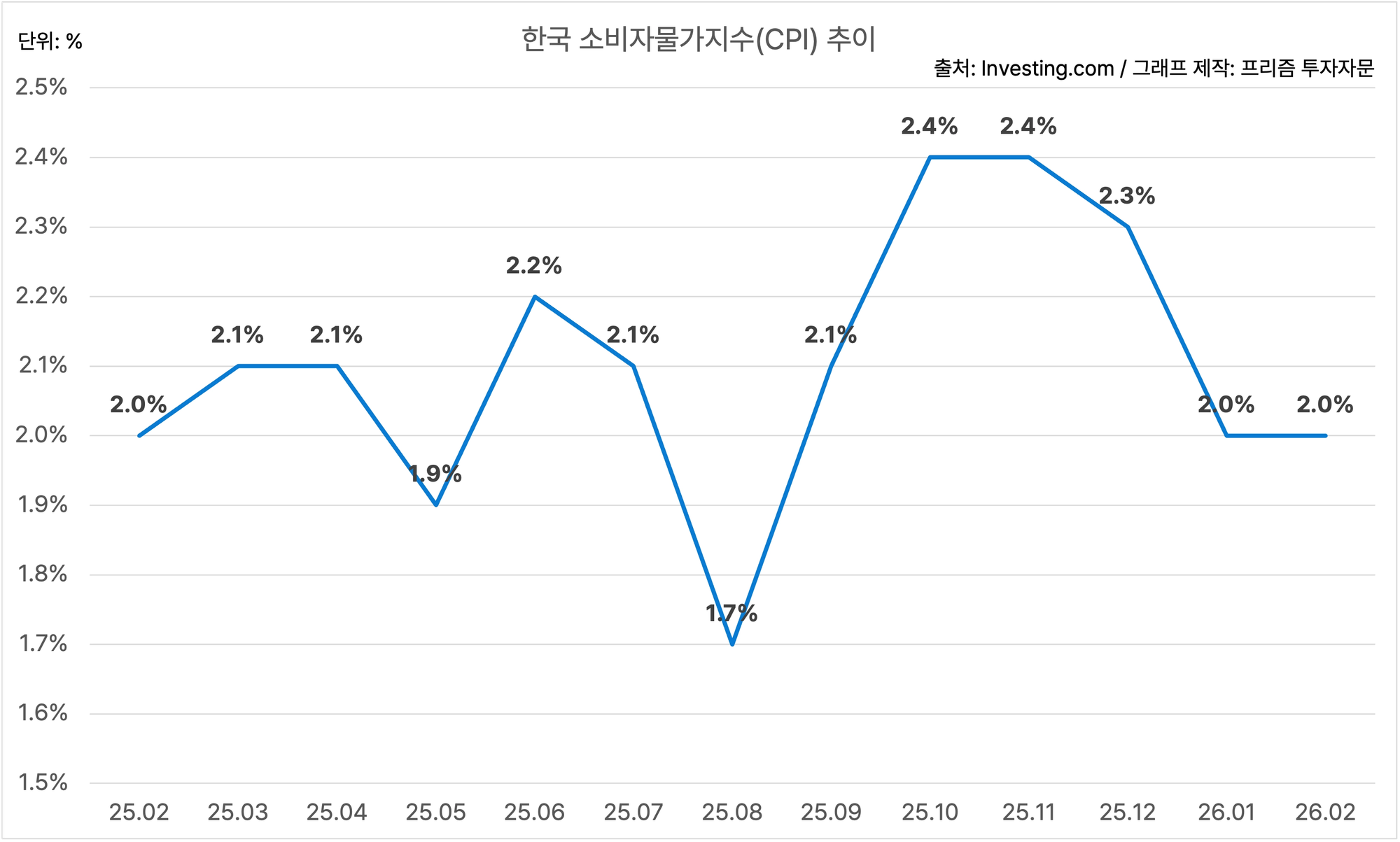 한국의 2월 소비자물가지수는 YoY 2.0%에요.