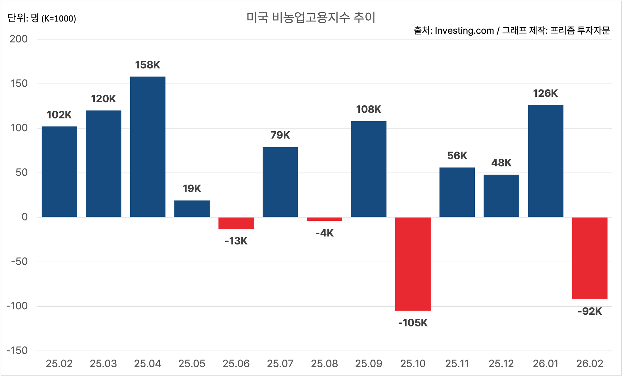 미국의 2월 비농업고용지수는 -92,000명이에요.