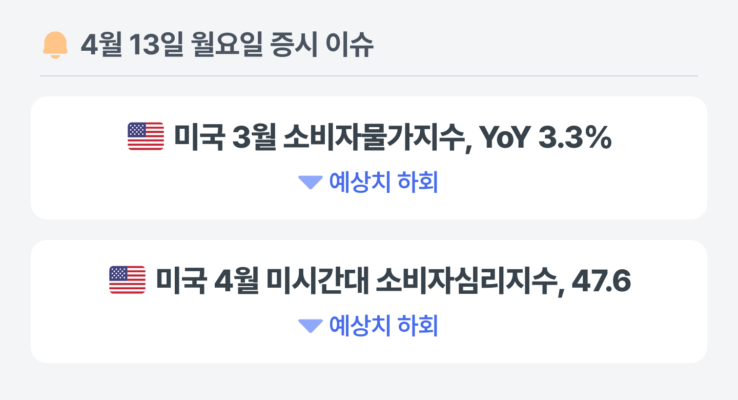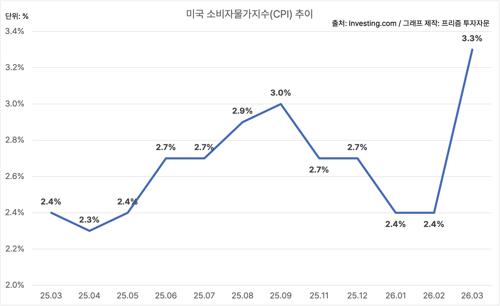 미국의 3월 소비자물가지수는 시장 예상치를 하회했으나, 이란 전쟁의 영향이 실질적으로 지표에 투영되기 시작한 첫 시점이라는 점에서 물가 경로의 불확실성이 증폭되는 분위기예요. 전쟁 여파가 인플레이션 우려를 재점화하고 있어, 고물가 국면의 장기화 가능성에 대한 우려가 계속될 전망이에요.