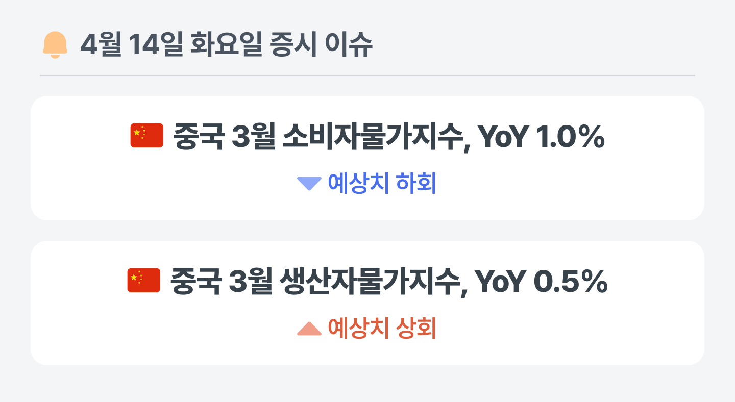 중국의 3월 소비자물가지수는 식품 가격의 계절성 요인 등이 반영되며 예상치를 하회했어요. 단기적인 상승 압력에도 불구하고 소비 회복의 지속 가능성이 낮아, 저물가 기조를 탈출하기 어려운 분위기에요.