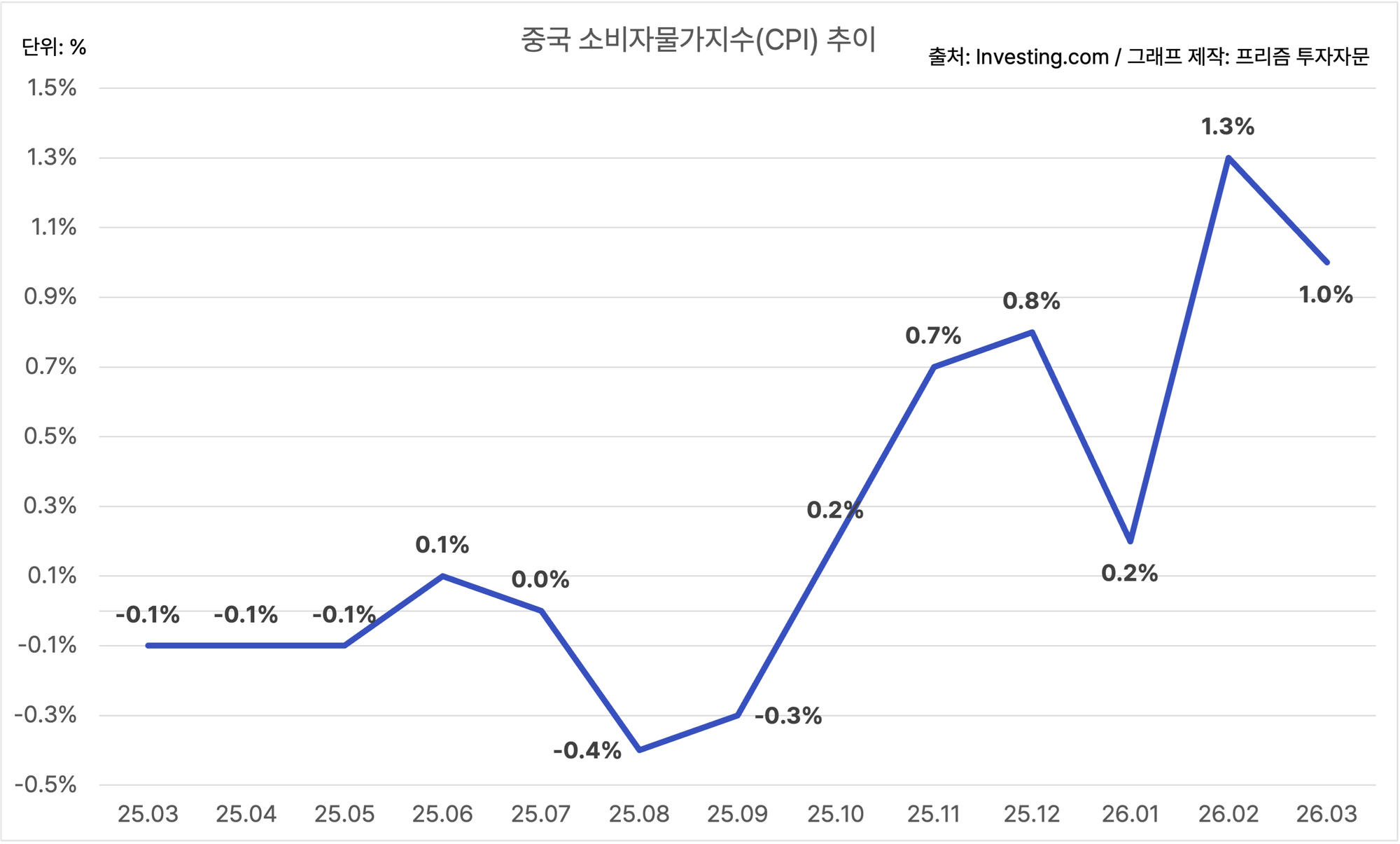 중국의 3월 소비자물가지수는 YoY 1.0%에요.