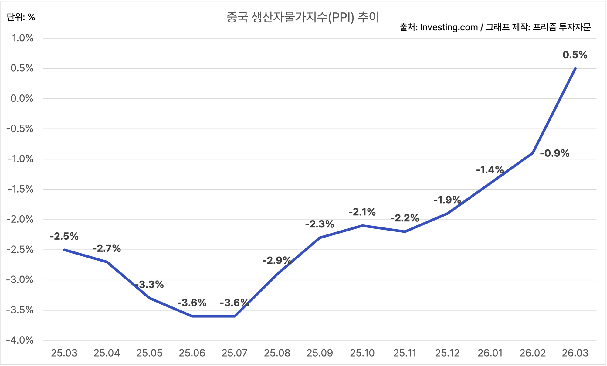 중국의 3월 생산자물가지수는 YoY 0.5%에요.