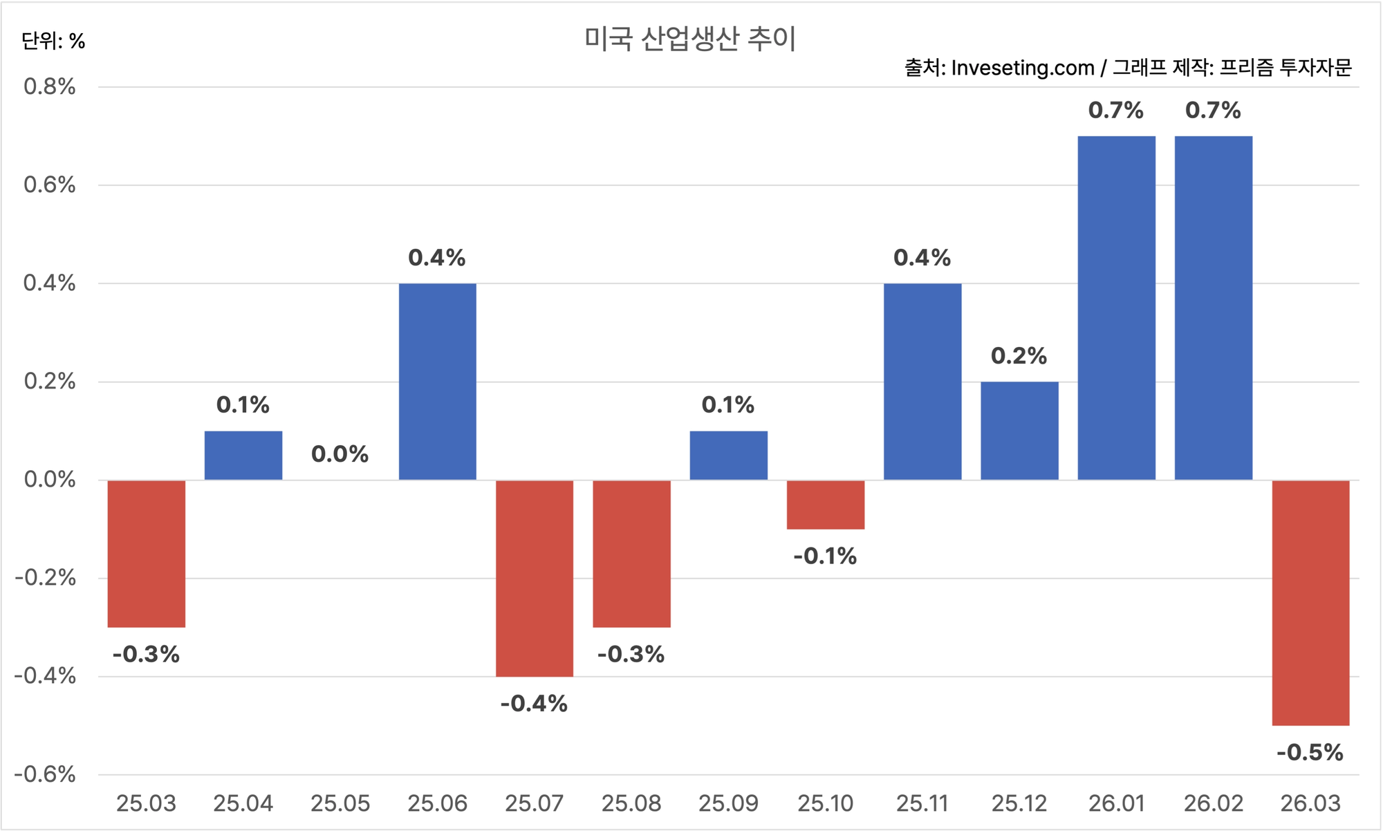 미국의 3월 산업생산은 MoM -0.5%에요.
