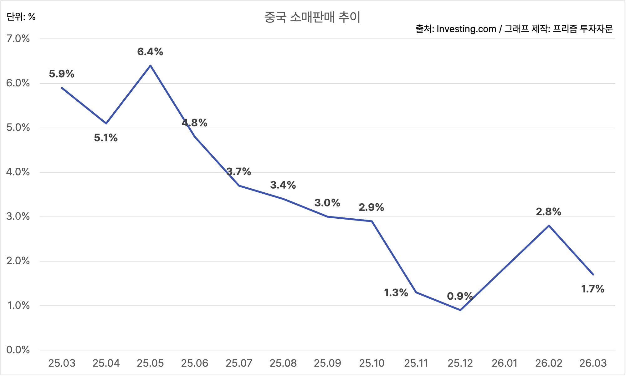 중국의 3월 소매판매는 YoY 1.7%에요.