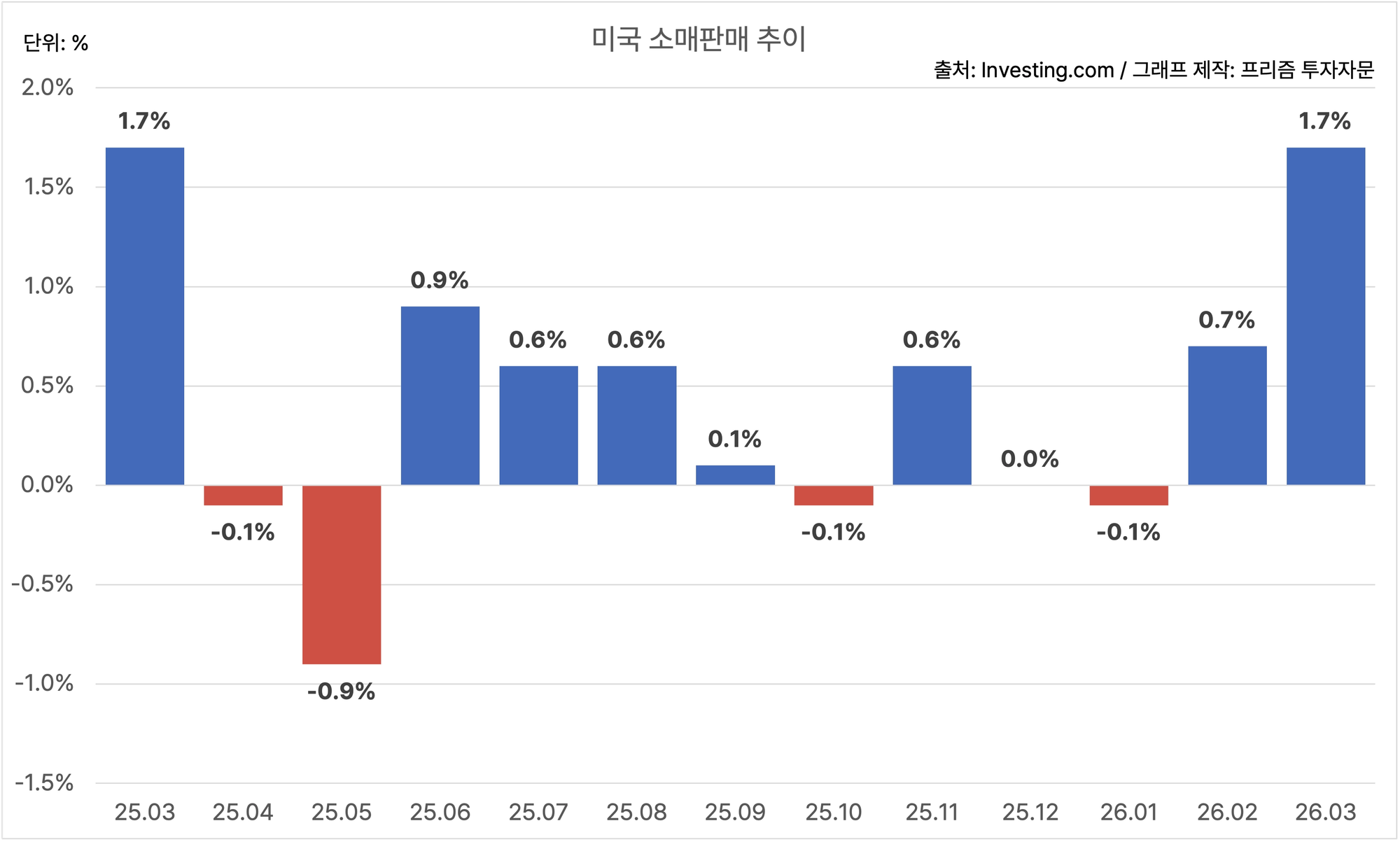 미국의 3월 소매판매는 MoM 1.7%에요.