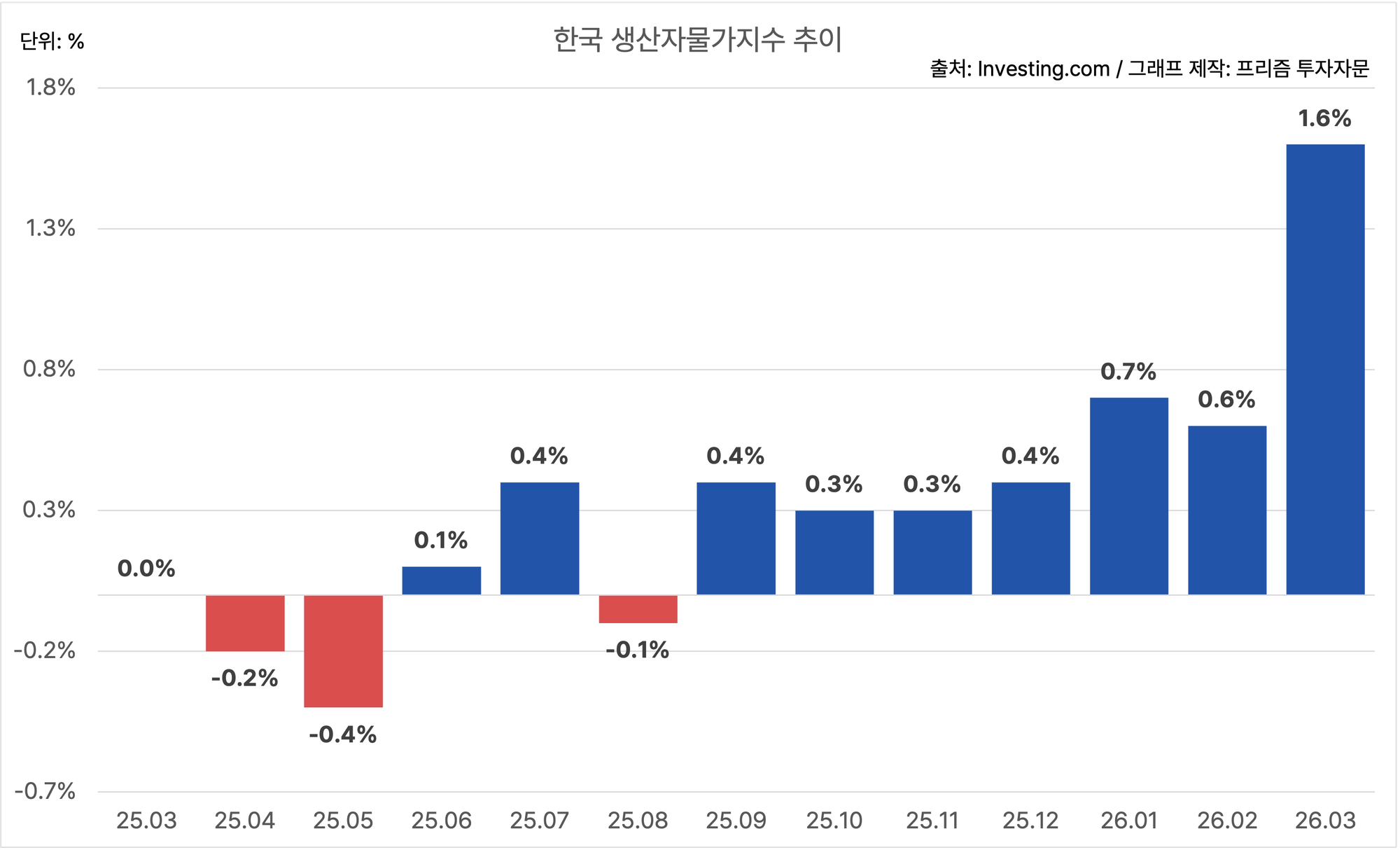 한국의 3월 생산자물가지수는 MoM 1.6%에요.