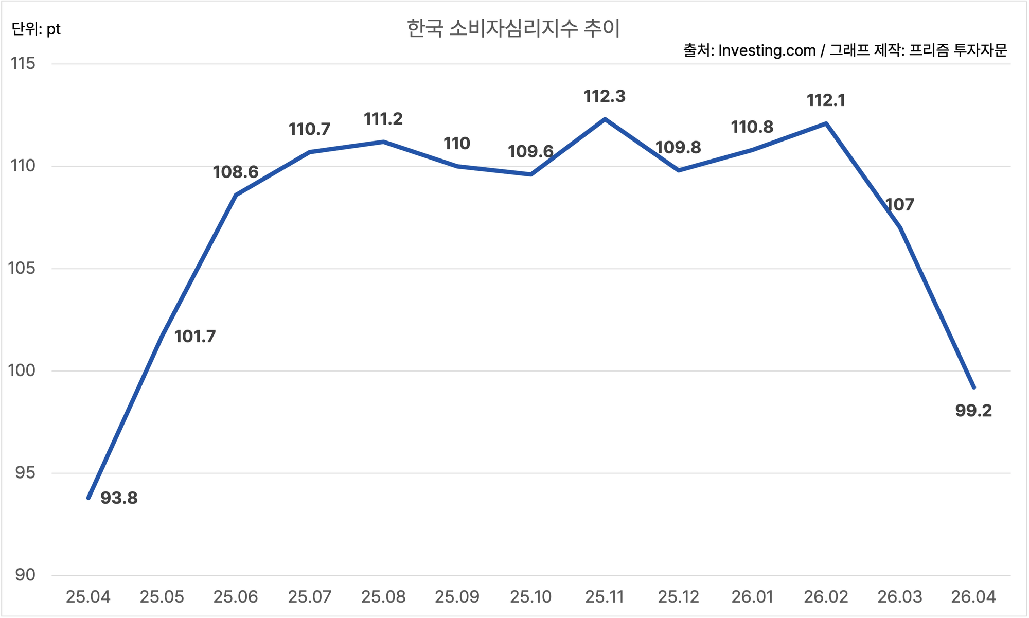 한국의 4월 소비자심리지수는 99.2에요.