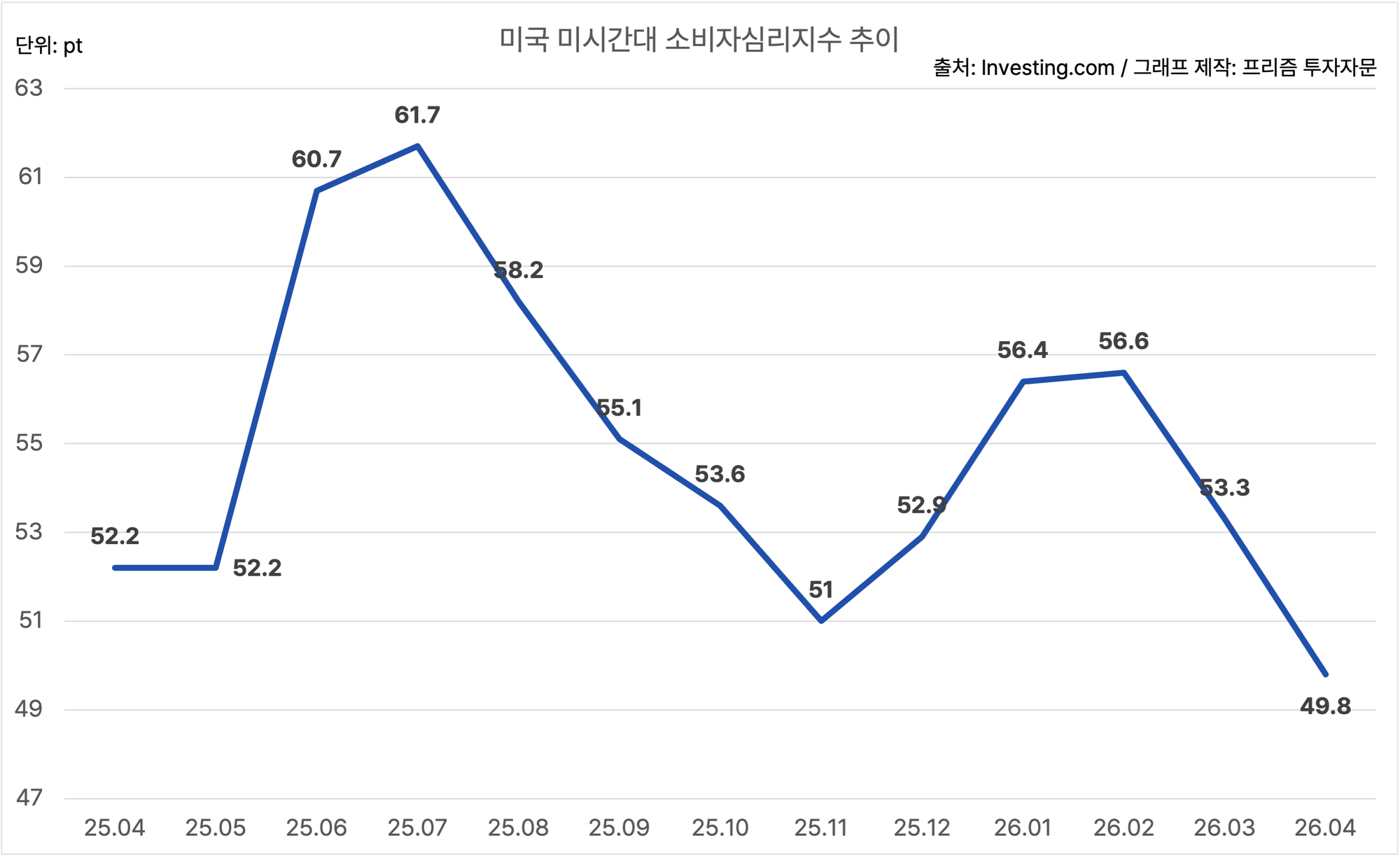 미국의 4월 미시간대 소비자심리지수는 49.8에요.