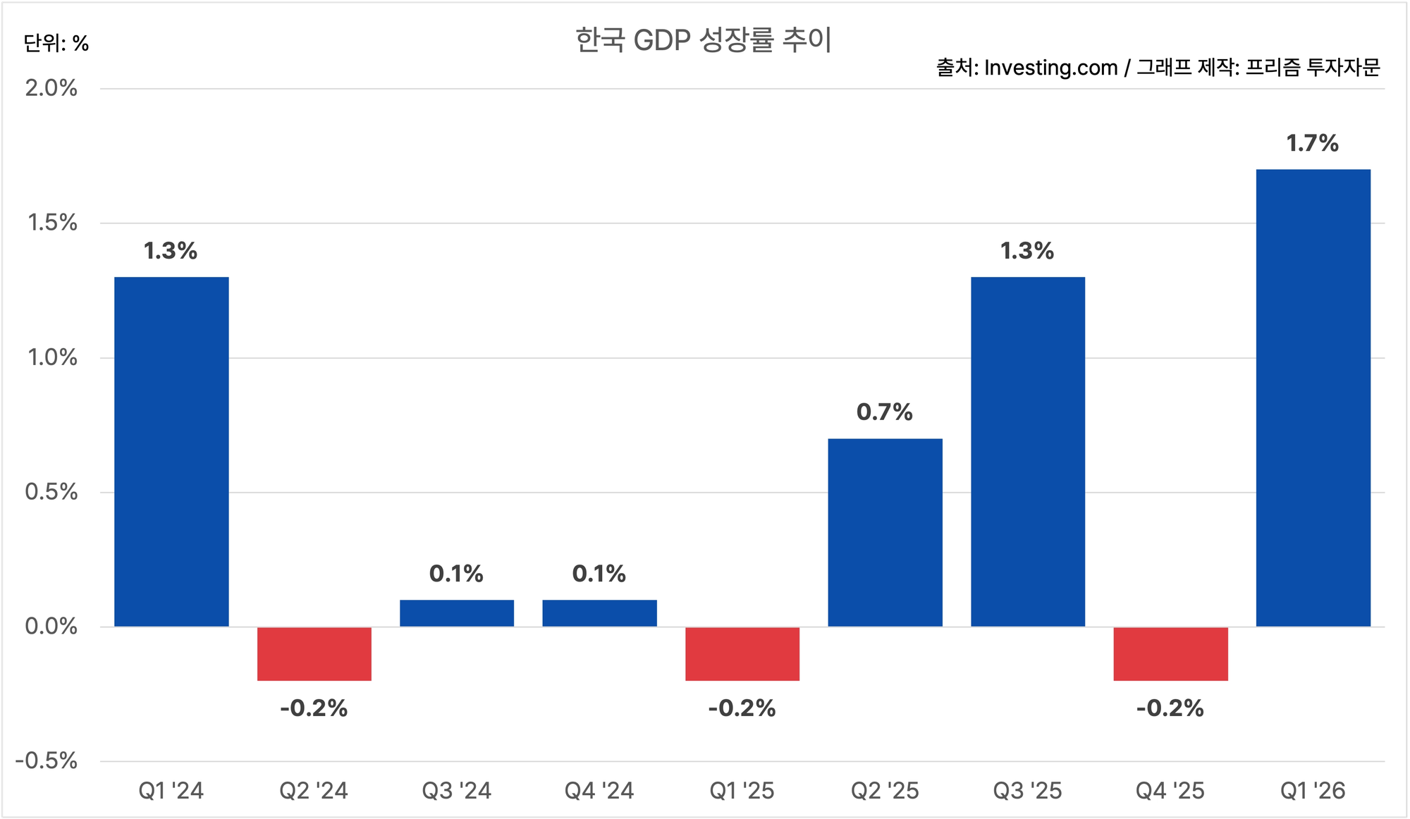 한국의 1분기 GDP 성장률은 QoQ 1.7%에요.