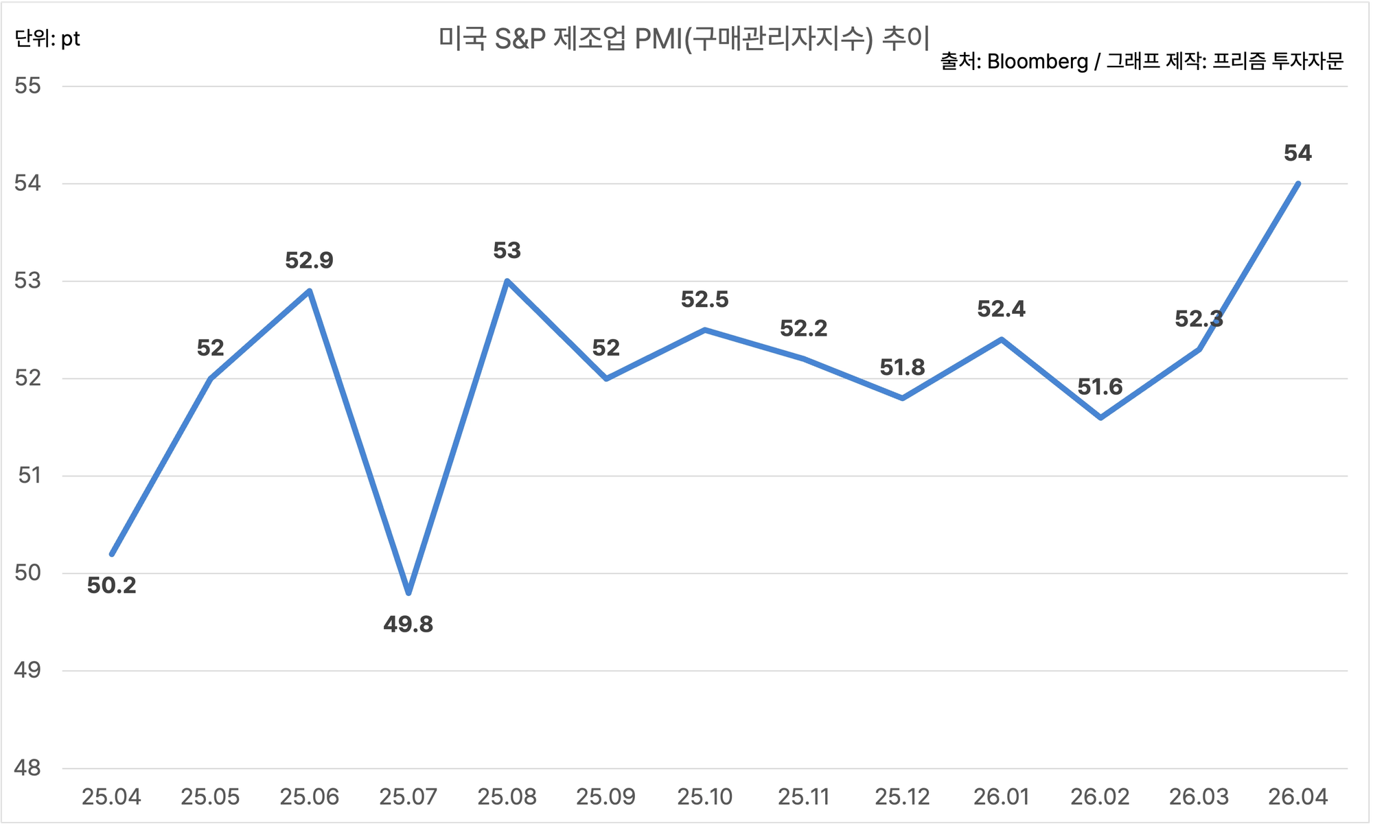 미국의 4월 S&P 제조업 PMI는 54.0이에요.