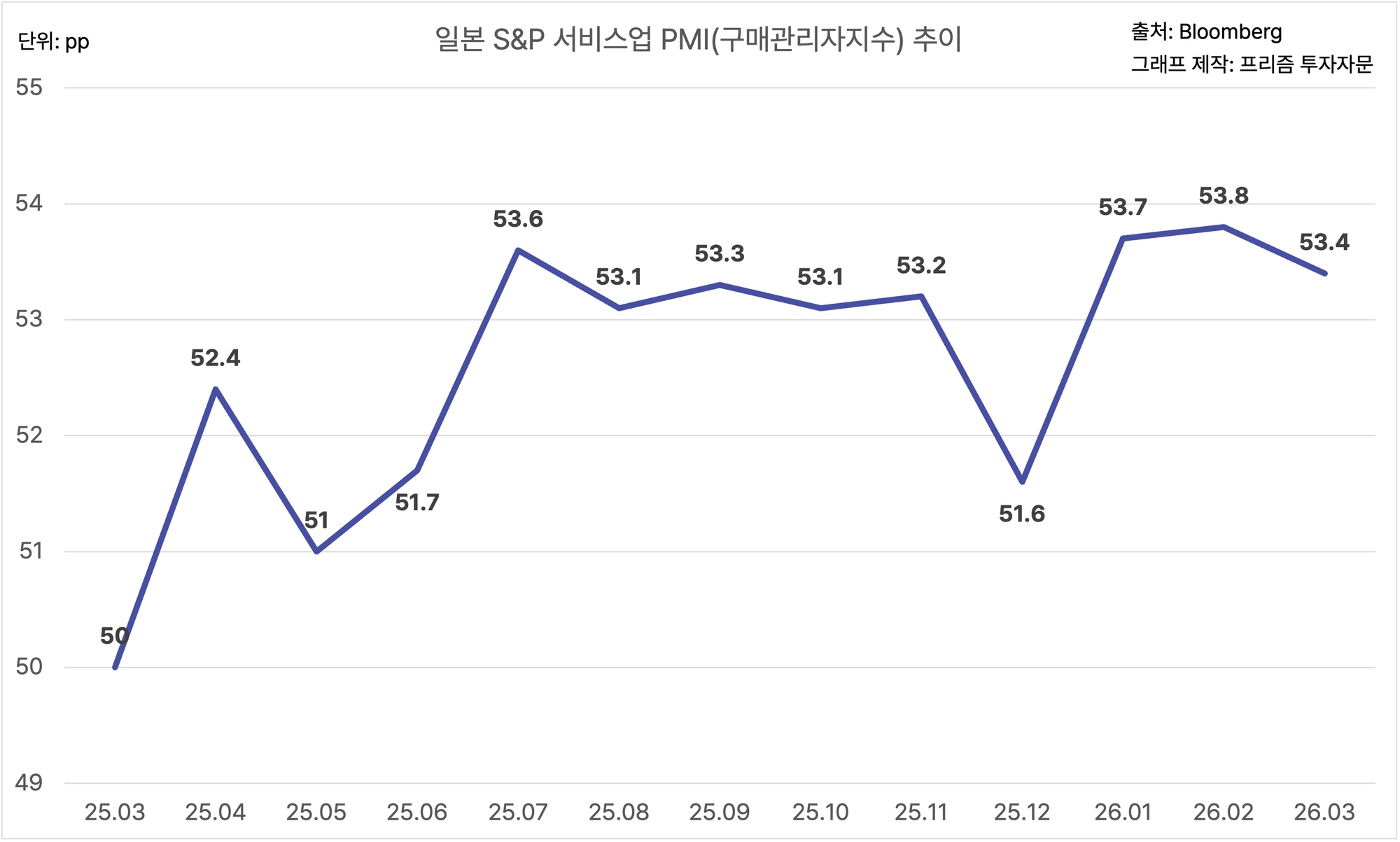 일본의 3월 S&P 서비스업 PMI는 53.4에요.