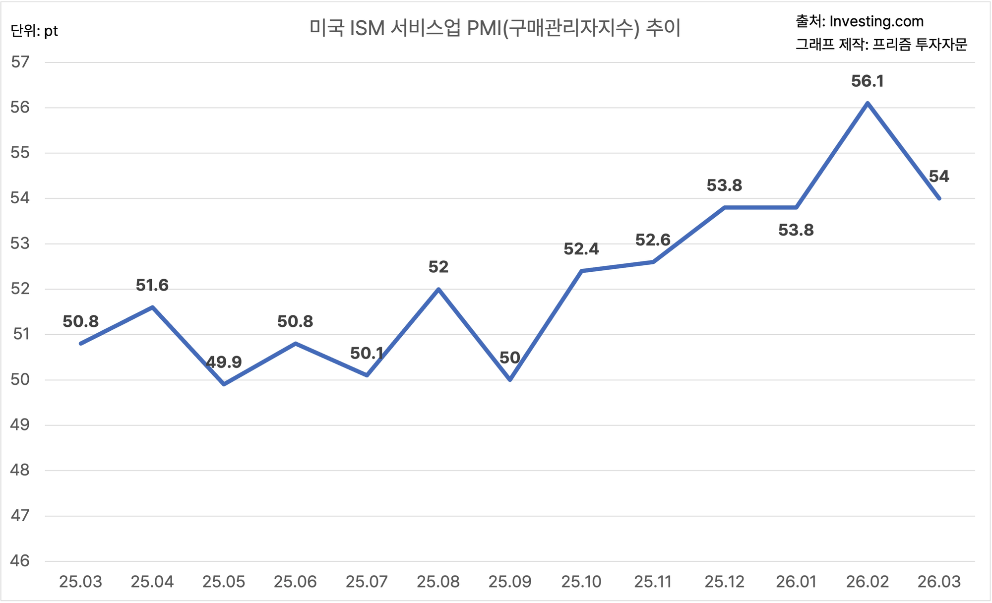 미국의 3월 ISM 서비스업 PMI는 54.0에요.