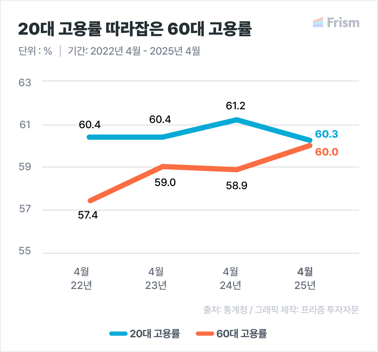 이는 2018년 1월(51.2%) 이후 꾸준한 상승세이며, 청년 구직난과 겹쳐 60대와 20대의 고용률 역전이 임박했음을 보여줍니다.