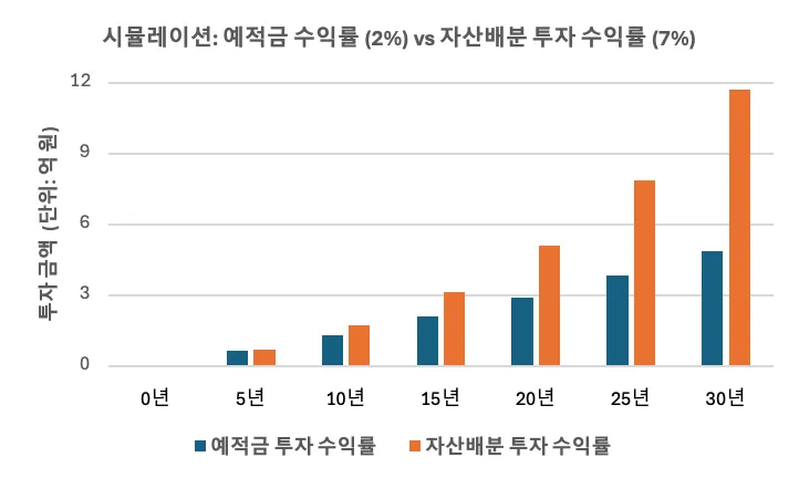 : 연 2% 예금과 연 7% 자산배분 투자는 30년 후 약 140%(6.8억 원) 이상의 자산 격차를 만듭니다. 이는 단순한 숫자의 차이가 아니라, 시간이 흐를수록 가속도가 붙는 복리의 원리가 가져오는 결과입니다.