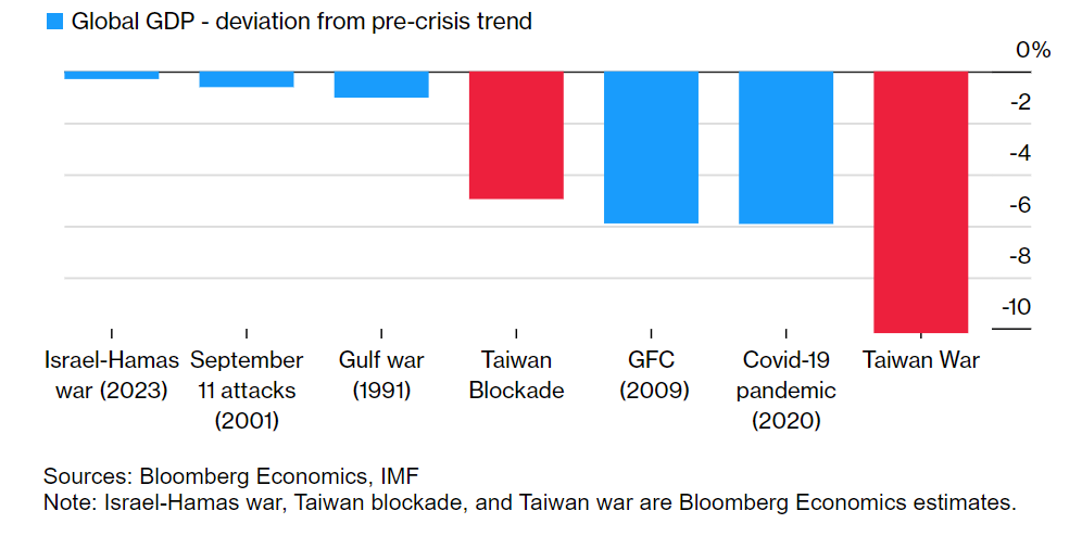 특히 반도체 생산에서 대만이 핵심적인 역할을 담당하고 있기 때문에 세계 경제에 미치는 영향은 매우 큽니다. 대만 해협에서 전쟁이 일어날 가능성은 높지 않습니다. 블룸버그 이코노믹스는 전쟁이 발생하면 칩 공급 차질, 무역로 차단, 경제 제재로 인해 전 세계 GDP의 10%에 달하는 비용이 발생할 수 있으며, 이는 글로벌 금융 위기나 팬데믹과 같은 대형 충격의 영향보다 더 클 것으로 추정합니다.