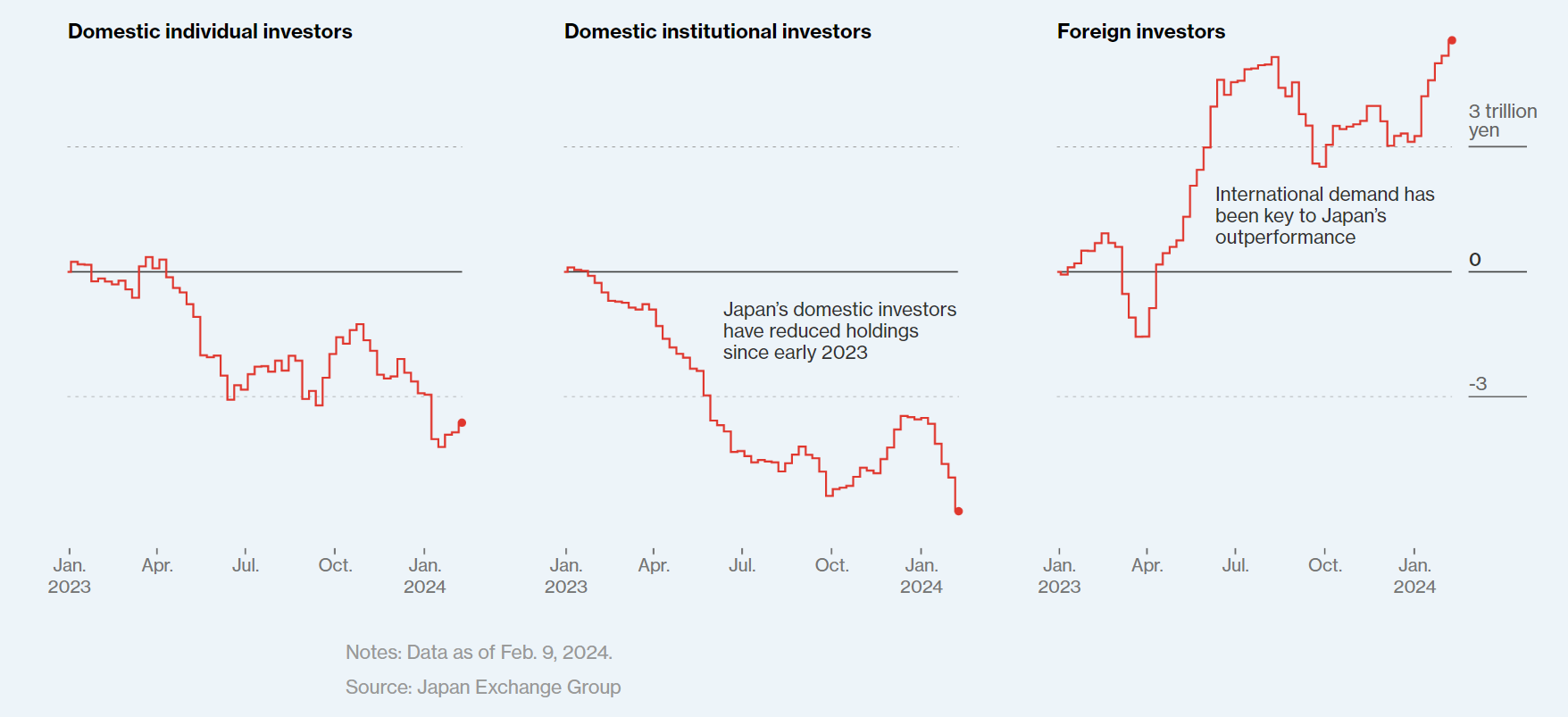 외국인 투자자들은 토픽스 프라임 지수 거래의 거의 70%를 차지하며 랠리의 원동력인 반면, 국내 매수자들은 대부분 방관하고 있습니다. 기관 투자자들은 포트폴리오를 축소했고, 일본 개인 투자자들은 1월 특별 비과세 계좌 확대 이후 미국 및 기타 해외 시장으로 몰려들고 있습니다. 이 결과 외국인 투자자들의 지분율은 1989년 5% 미만에서 2023년 30%로 증가했습니다.