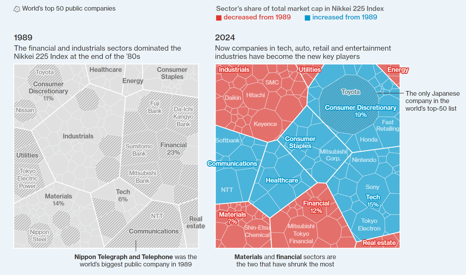 1989년에는 글로벌 시가총액 기준 상위 50개 기업 중 32개를 일본 기업이 차지했습니다. 오늘날 일본 기업은 도요타 자동차 한 곳만이 글로벌 상위 50개 기업 리스트에 이름을 올렸습니다.
