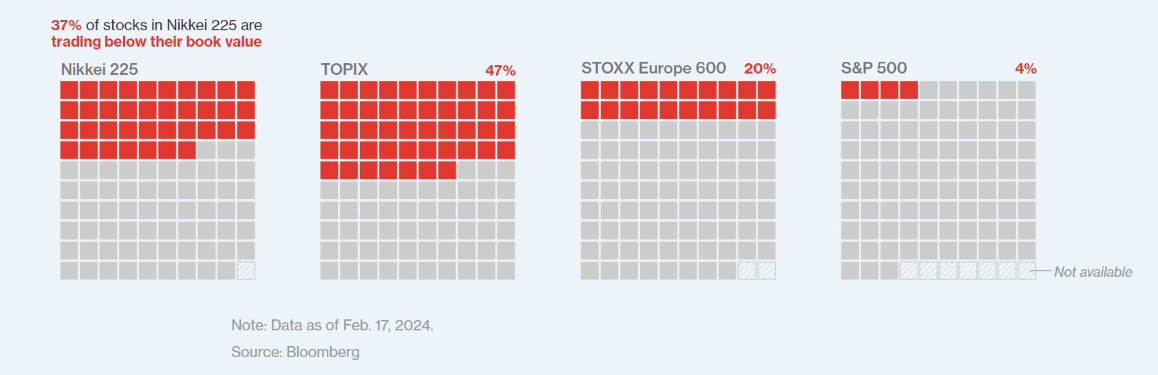 반면 S&P 500 주식의 3%만이 장부가 이하로 거래되고 있습니다. 유로 스톡스 600의 경우 5분의 1만이 이 범주에 속합니다. 현재 일본의 낮은 밸류에이션은 자산 가격이 극단에 달했던 1989년과 극명한 대조를 이룹니다.