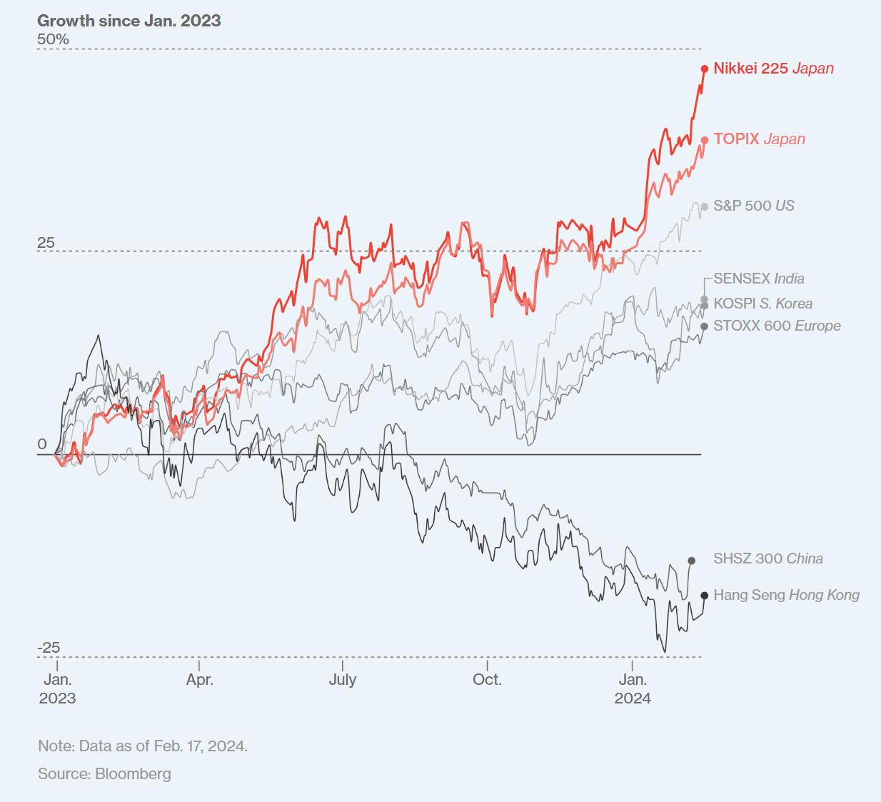 "글로벌 투자자들이 일본이 변했다는 사실을 받아들이는 데는 오랜 시간이 걸렸습니다."라고 시장의 부활을 예측한 최초의 주요 증권사 중 하나인 모건 스탠리의 수석 아시아 전략가인 조나단 가너는 말했습니다. 그는 기업 수익이 지속적으로 성장하고 수익성이 개선되면서 해외에서는 "일본이 추세적인 강세장에 진입했다"는 데 더 큰 공감대가 형성되고 있다고 말했습니다.