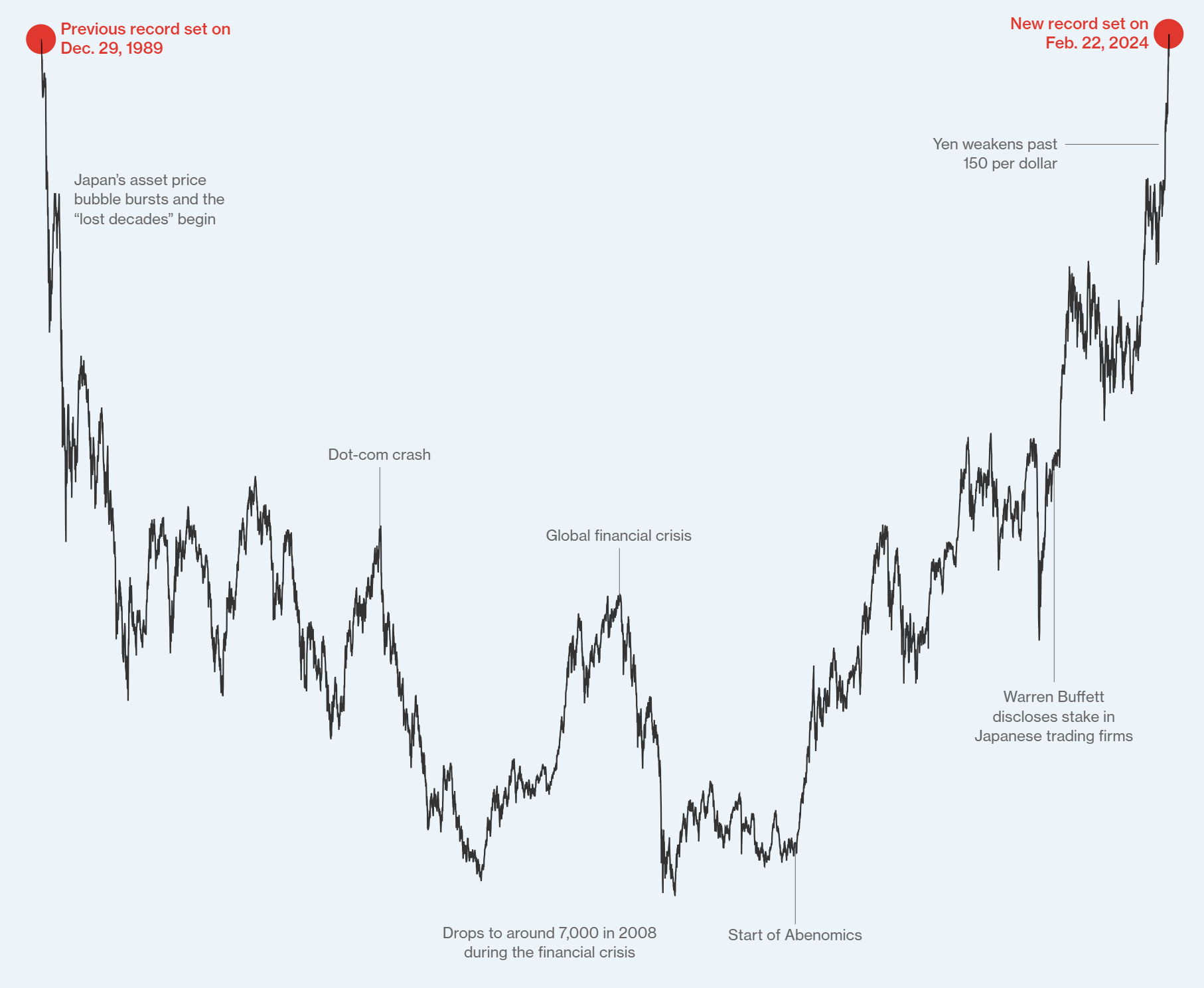 2024년 2월 22일(목), 닛케이 225 지수는 39,098.68로 마감하며 마침내 종전 기록을 경신했습니다. 대공황 이후 미국 증시의 회복 기간보다 훨씬 더 오래 걸린 이 ‘장대한 회복’은 일본 주식 시장의 부활을 의미합니다.