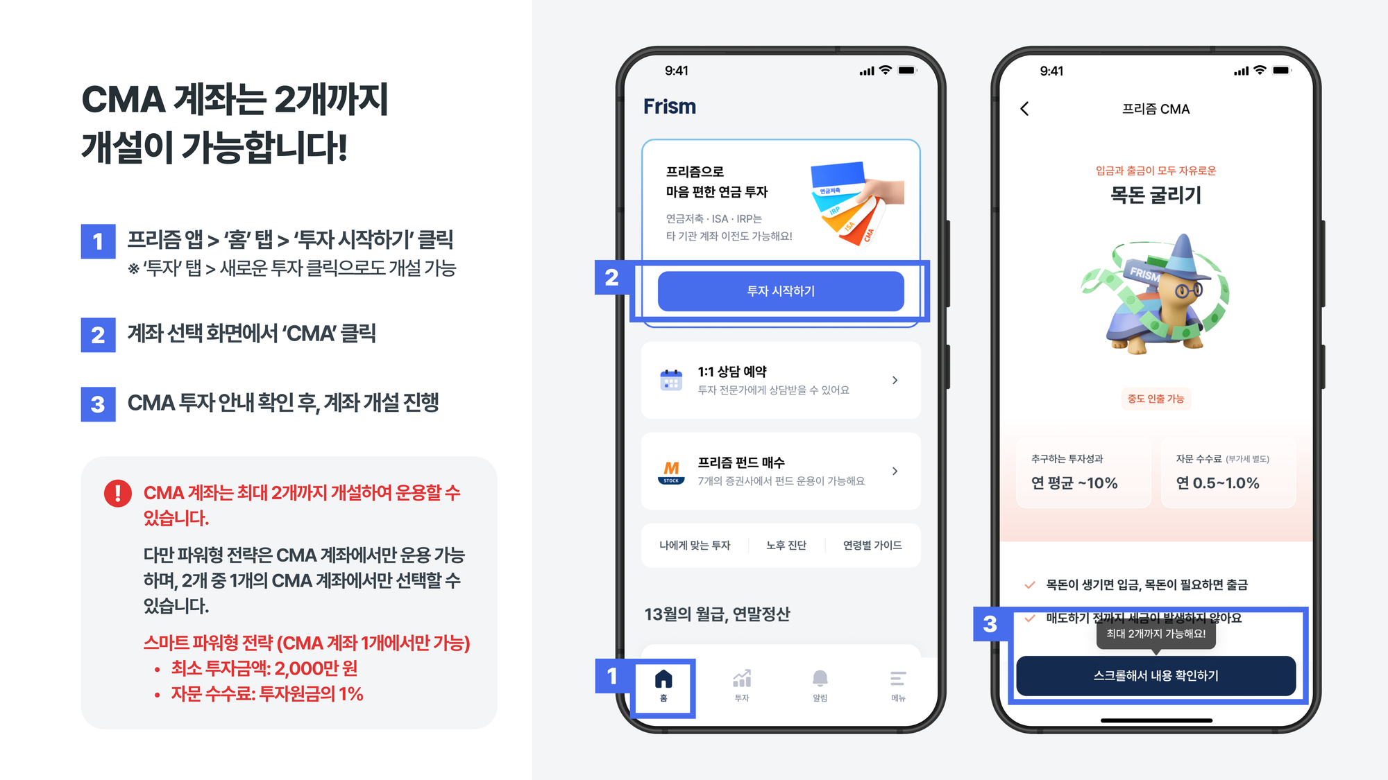 - 이제 CMA 계좌를 2개 이상 개설 가능합니다.