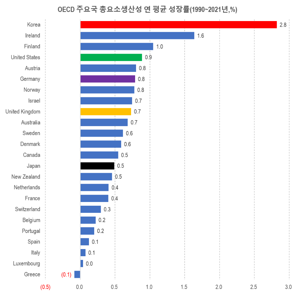 아래 <그림>은 1990년부터 2021년까지 약 30년이 넘는 기간 동안의 연 평균 총요소생산성 향상률을 보여줍니다. 한국이 연 2.8% 성장해서 압도적인 1등이며, 인구가 어느 정도 되는 나라 중에서는 미국이 0.9%로 2위를 차지했습니다. 그 밑으로는 독일과 영국, 그리고 캐나다와 일본이 위치하고 있군요.
