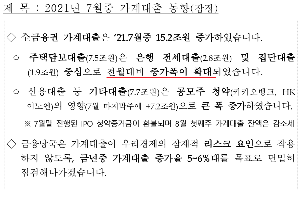 최근 금융위원회가 발표한 "2021년 7월 중 가계대출 동향" 자료에 따르면, 전 금융권의 가계대출은 한 달 동안 15.2조원 늘어난 것으로 집계되었습니다. 특히 주택담보대출이 전월에 비해 7.5조원 늘어나는 등 주택시장으로 유동성이 집중되는 경향이 있음을 알 수 있습니다. 이에 정책당국은 강력한 대출 억제 정책을 실행에 옮기는 모습입니다('링크' 기사 참고)