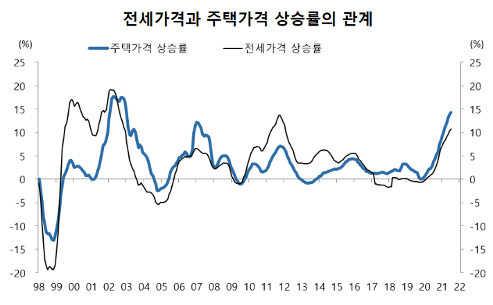 아래의 <그림>은 주택 매매가격 상승률과 전세가격 상승률의 관계를 보여줍니다. 1999~2002년, 그리고 2009~2013년처럼 전세가격의 상승이 나타날 때마다 주택매매 가격의 상승이 뒤따르는 것을 발견할 수 있습니다.