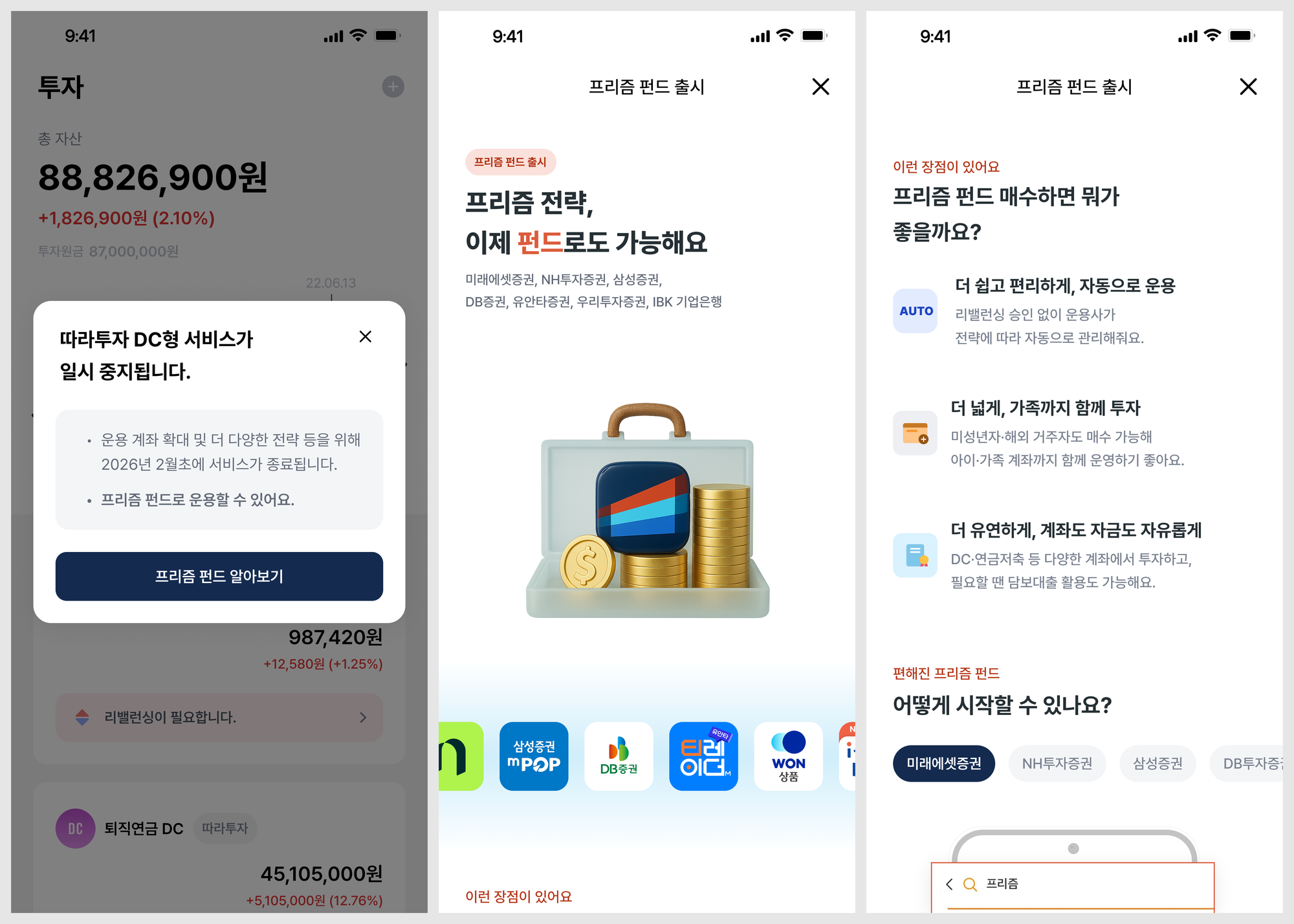 그동안 프리즘 따라투자(DC형) 서비스를 이용해 주신 고객 여러분께 진심으로 감사드립니다. 프리즘은 더 나은 투자 경험을 제공해 드리기 위해 따라투자 서비스를 새롭게 개편하고 있으며, 이에 따라 기존 DC형 따라투자 서비스는 종료될 예정입니다.