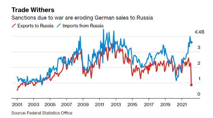 German exports to Russia plummeted to their lowest in almost two decades, with the fallout from President Vladimir Putin’s attack on Ukraine also contributing to a drop in overall trade.