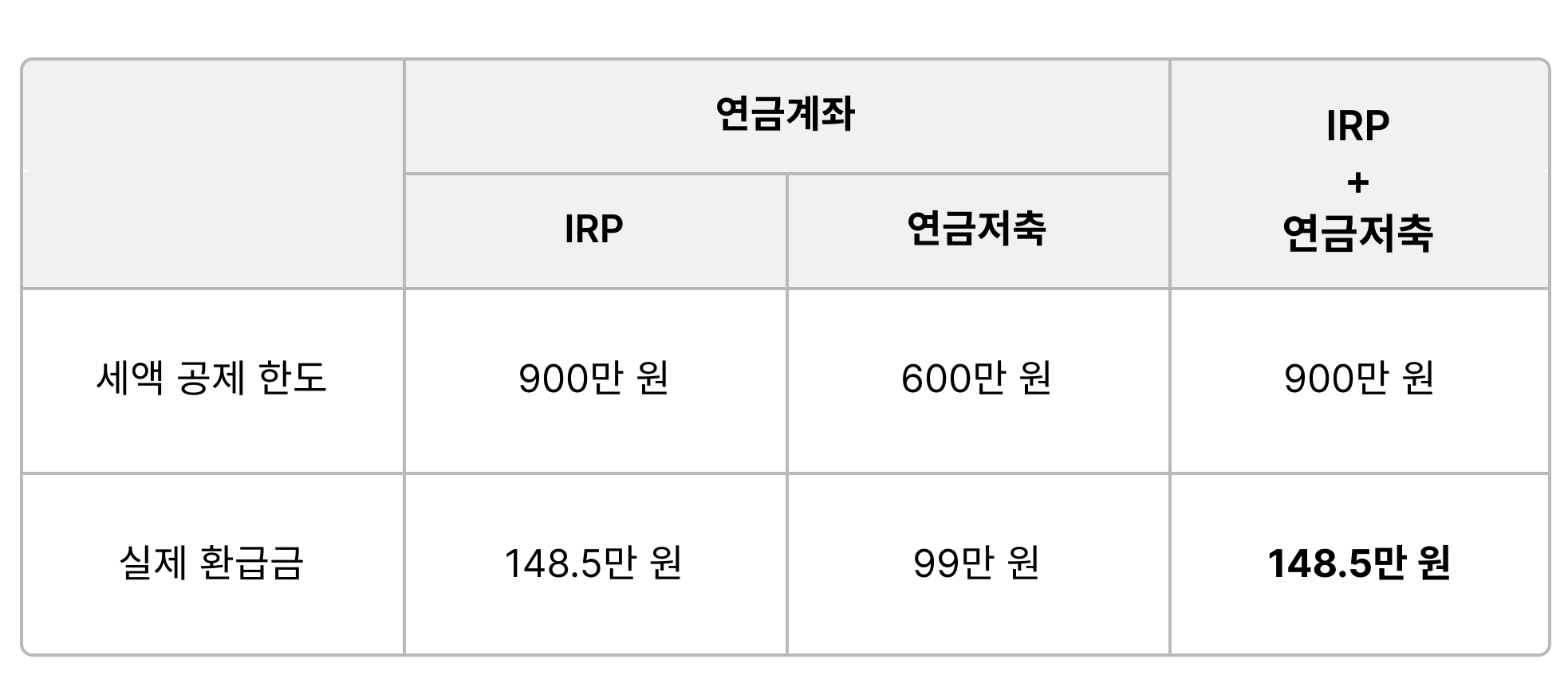 다만 IRP와 연금저축을 더했을 때의 한도가 900만 원이기 때문에, 두 계좌를 합해 최대 148.5만 원을 받을 수 있습니다.