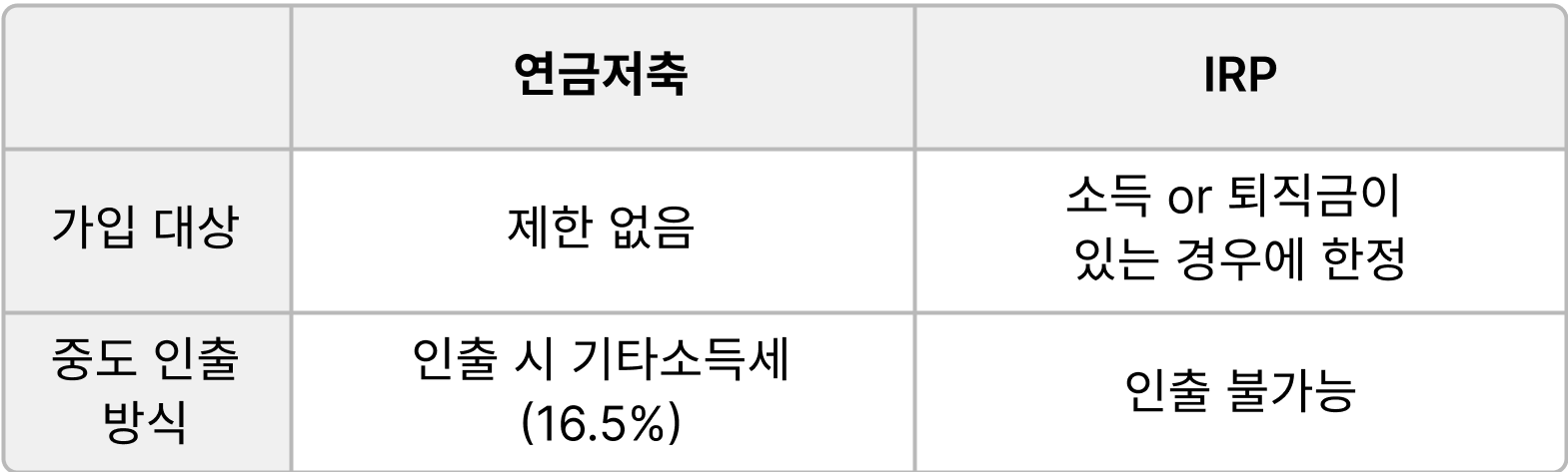 다음은 연금저축과 IRP를 비교한 표입니다.