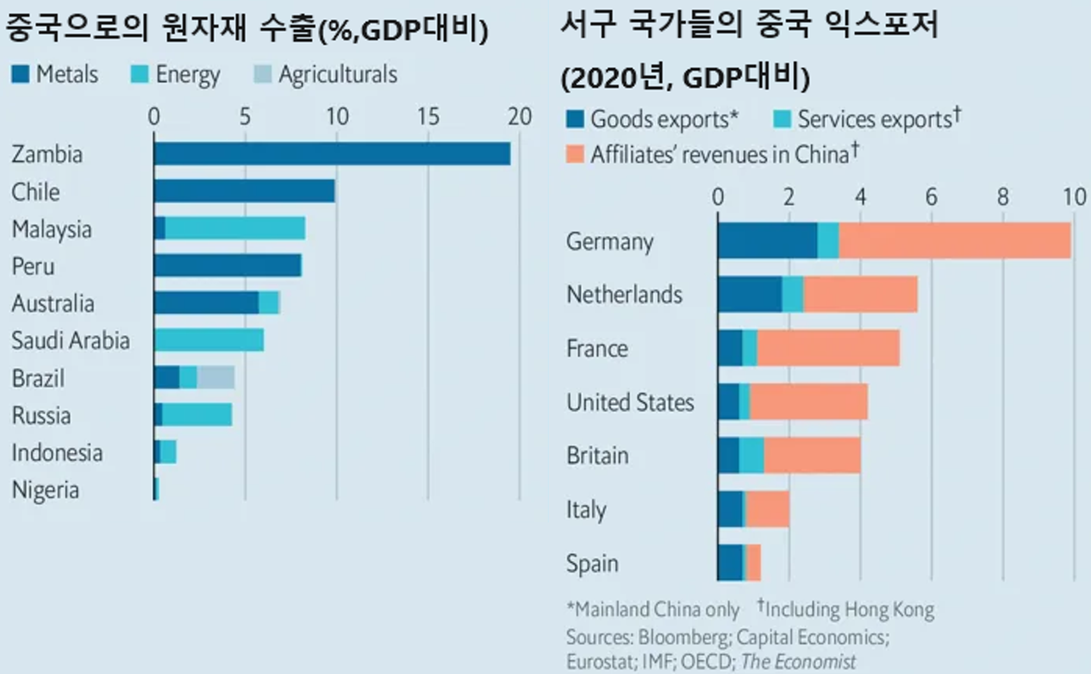 이번 시간에는 세계적인 경제 주간지, 이코노미스트의 기사(What China’s economic troubles mean for the world)를 소개합니다. 간단하게 요약하자면, 중국 성장 탄력 둔화가 원자재 생산 국가들에게 큰 악영향을 미칠 가능성이 높으며 선진국 중에서는 특히 독일이 받을 충격이 크다는 내용입니다. 보다 자세한 내용은 아래의 요약 글을 참고하시기 바랍니다.
