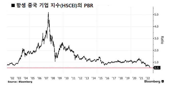 아래 <그림>은 2002년 이후 항셍 중국 기업 지수(HSCEI)의 주가순자산비율(PBR)을 보여주고 있습니다. 홍콩과 중국 증시가 폭락한 영향으로 항셍 중국 기업 지수의 주가순자산비율(주가/주당순자산가치)이 20년 만에 가장 낮은 수준인 0.5를 기록했습니다.