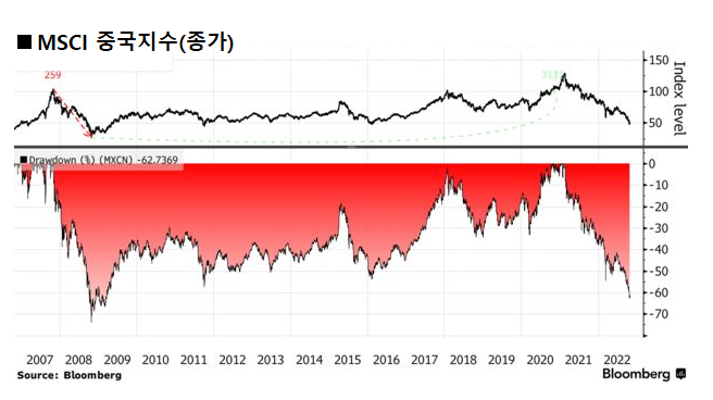 아래 <그림>은 2007년 이후 MSCI 중국 지수 추이와 낙폭의 정도를 보여주고 있습니다. 중국 증시는 2021년 고점 이후 하락세로 돌아섰는데 그 정도가 2008년 글로벌 금융위기와 유사한 것을 알 수 있습니다.