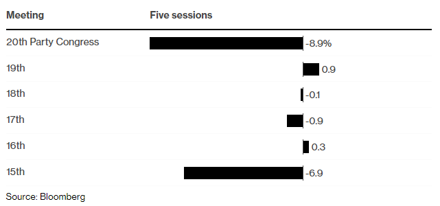 당 대회 직후 홍콩 증시의 항셍 중국 기업 지수(HSCEI)는 약 9% 하락하며 2008년 이후 최저 수준으로 떨어졌습니다.