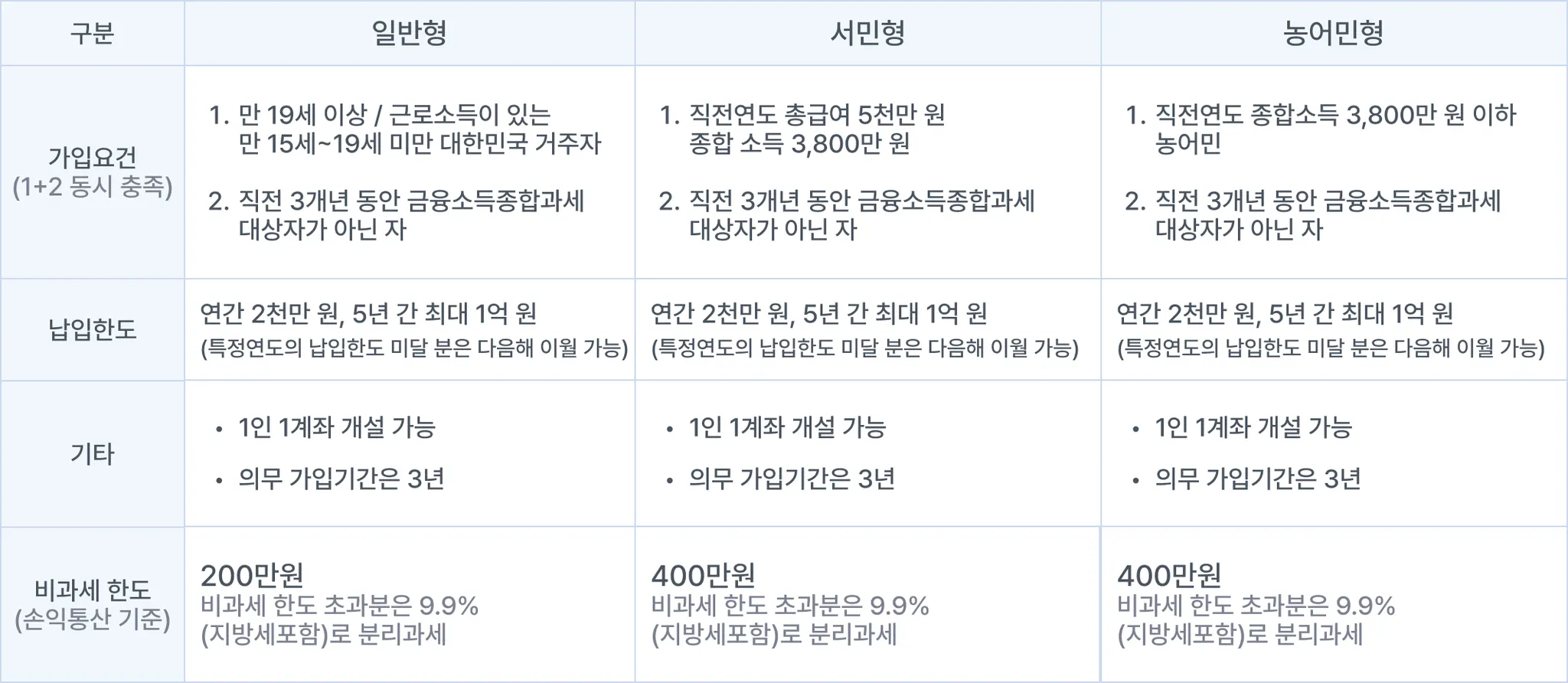 - 저율과세 효과: 이자·배당 소득에 대해 일반 200만 원 / 서민형 400만 원까지 비과세되며, 비과세 한도 초과분도 9.9% 저율 분리과세됩니다.