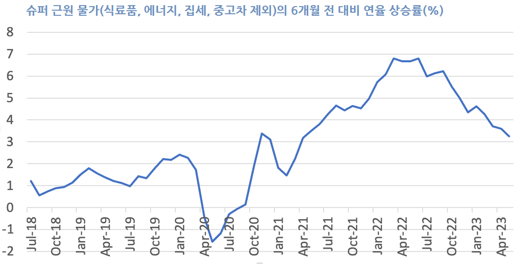 중고차와 임대료 등 최근 문제가 되고 있는 제품을 제외한 이른바 '슈퍼 코어' 물가의 6개월 전 대비 연율 상승률을 살펴보면 다음과 같습니다