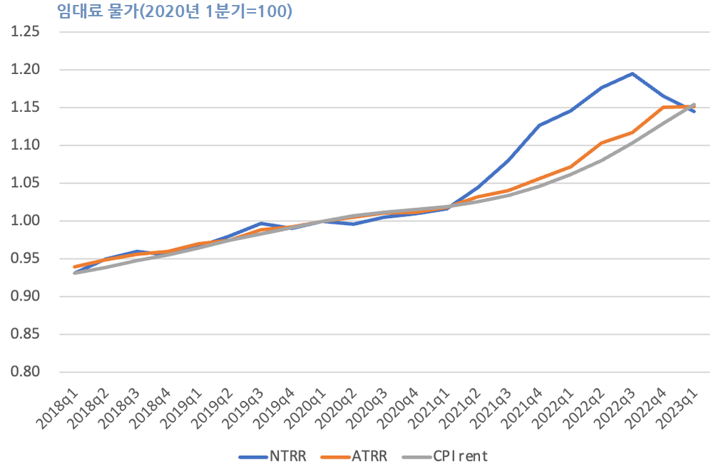 이제 이러한 급등세는 한풀 꺾였습니다. Zillow 등 시장 임대료에 대한 여러 민간 추정치를 통해 이를 알 수 있으며, 이제 공식적인 수치도 확보했습니다. 노동통계국의 연구원들은 평균 임대료(ATRR)와 신규 세입자 임대료(NTRR)를 모두 계산하는데, NTRR은 실제로 하락하고 있지만 ATRR은 예전보다 훨씬 적기는 하지만 여전히 상승하고 있습니다.