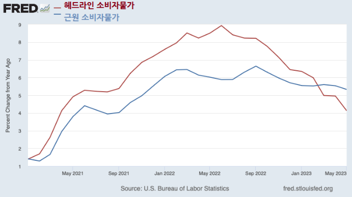 제가 본 많은 보고서에서 이런 말이 나왔습니다: "5월에 헤드라인 인플레이션은 하락했지만 근원 인플레이션은 여전히 높은 수준을 유지했다." 이런 식의 주장은 우리가 인플레 퇴치 면에서 큰 진전을 이루지 못하고 있다는 인상을 전달합니다. 실제로 아래 <그림>은 근원 인플레가 아직 안정되지 못한 것으로 보입니다.