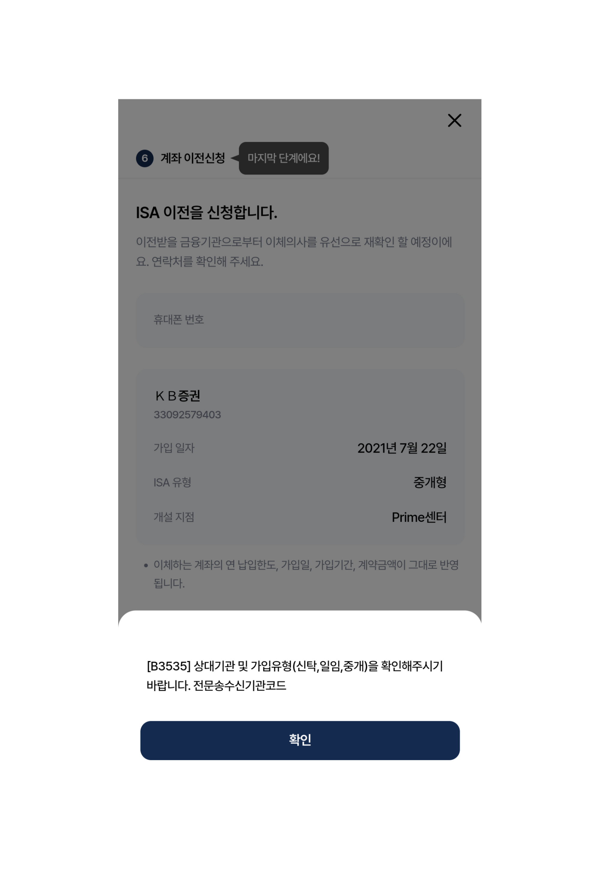 - 정확히 신청한 것 같은데, '[B3535] 상대기관 및 가입유형(신탁, 일임, 중개)을 확인해주시기 바랍니다.'라는 오류 메시지가 나와요.