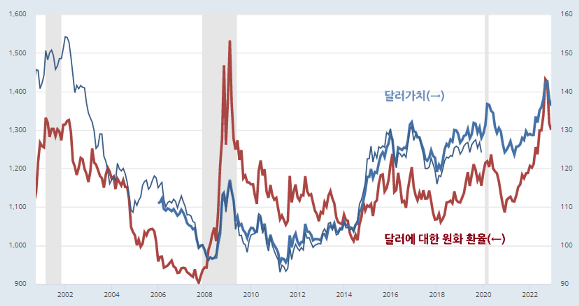 - 달러에 대한 원화 환율은 2022년 초 1,188원 전후였다 11월 말 1,317원을 기록해 약 10.8% 상승했고, 같은 기간 달러 가치는 7.2% 상승함.
