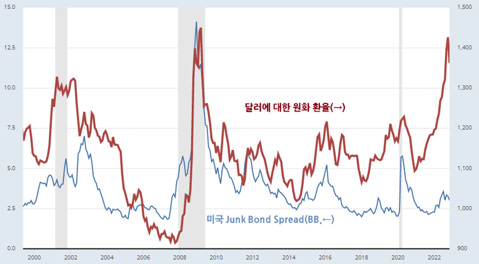 <그림 2> 달러에 대한 원화 환율 vs. 미국 Junk Bond Spread(%p)