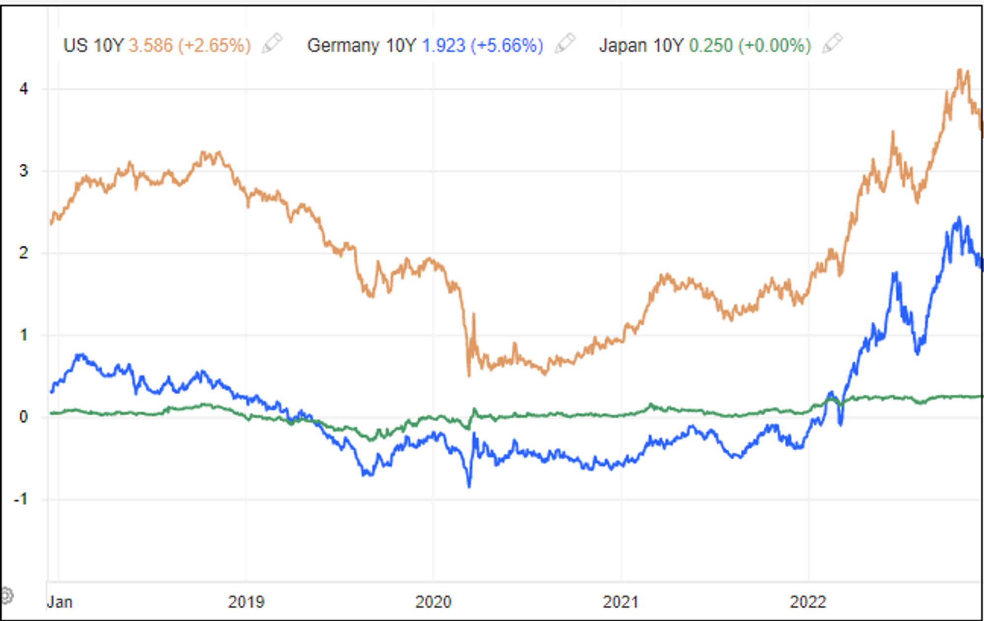 미국 달러가 주요 통화에 대해 강세를 보인 가장 직접적인 이유는 금리 격차 때문이었습니다. 미국 국채 금리는 12월 9일 기준 3.59%를 기록하고 있는데, 독일은 1.92% 일본은 0.25%에 불과합니다. 참고로 11월 초에는 미국 4.23% 독일 2.34% 일본 0.25%로 금리 격차가 지금보다 훨씬 컸습니다.