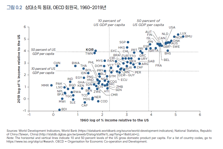 일반적으로 저소득국가가 중진국(위의 <그림 0.2>에서는 미국 1인당 국민소득의 10%에서 50% 사이의 국가)이 되는 것은 어느 정도 가능합니다. 경제를 개방하고 정부가 선진국 원조를 활용해 교육 및 사회간접자본 투자에 (어느 정도) 활용하는 것 만으로 경제 성장이 가능합니다.