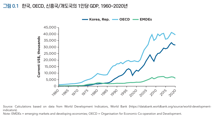 아래 <그림 0.1>의 녹색선이 개발도상국(이하 ‘개도국’)의 1인 당 소득을 보여주는데, 2008년 글로벌 금융위기 이후 정체 상태에 빠진 것을 발견할 수 있습니다. 세계화의 흐름이 약화되고 무역전쟁이 촉발되는 환경에서 개도국이 큰 타격을 받은 반면, 진한 파란 선으로 표시된 한국의 1인당 국민소득이 지속적으로 증가한 것을 발견할 수 있죠. 즉, 한국은 중진국 함정을 빠져나온 유이한 나라(다른 한 나라는 대만)임을 알 수 있습니다.