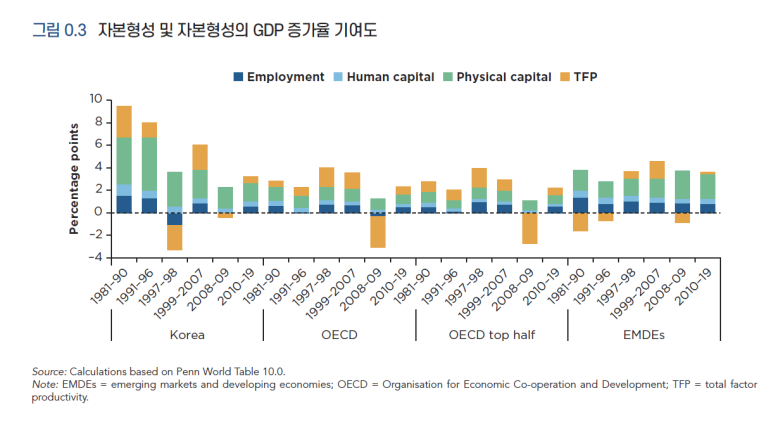 그러나 한국은 이때부터 새로운 성장 경로를 발견했습니다. 그것은 바로 ‘생산성 주도’ 성장이죠. 아래의 <그림 0.3>은 각국의 경제성장률을 요인 별로 분해한 것입니다. 진한 파란 막대가 노동력의 투입이 유발한 경제성장이며, 하늘색 막대는 노동력의 질적 수준 변화를 나타냅니다. 청록색 막대는 자본투입량의 기여인데, 80년대와 90년대 중반까지 한국 경제가 고속 성장한 배경이 바로 자본투입량의 급격한 증가 때문임을 금방 알 수 있습니다. 마지막으로 주황색 막대는 TFP(총요소생산성)의 기여를 보여줍니다.