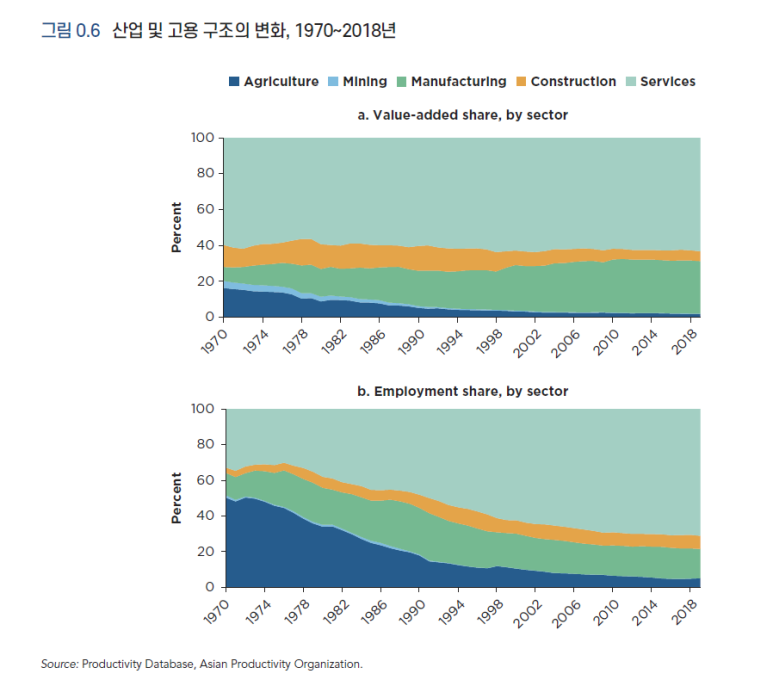 그 해답은 서비스 및 농업부문의 지체에 있습니다. 아래의 <그림 0.6>의 a파트는 부가가치 기준 각 부문의 비중을 보여주며, b은 각 부문의 고용 비중을 나타냅니다. 가장 진한 파란 영역이 농업, 하늘색 영역은 광업 진한 청록색은 제조업 주황 영역은 건설업 그리고 옅은 청록색은 서비스업입니다.